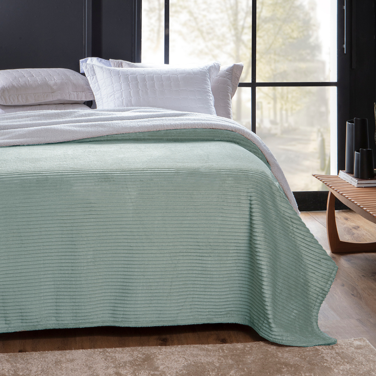Fabricado em 100% poliéster com um luxuoso acabamento sherpa, este cobertor oferece a sensação indulgente de pele de carneiro, combinada com um toque macio que é um convite ao conforto.