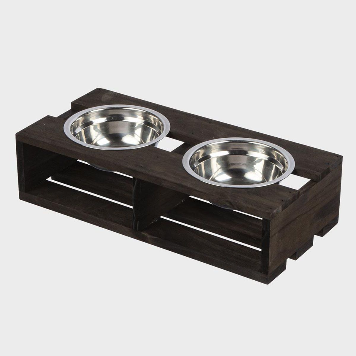 O Comedor pet com dois potes, tem a altura ideal para não prejudica a coluna do seu animalzinho, alto e fácil de limpar. Seu suporte é de madeira e os potes em inox.