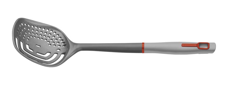Alia cabo ergonômico de polipropileno, bojo produzido em nylon com furo para retirar temperos e furos para escoar líquidos à uma construção que resiste a 180º C de temperatura e pode ir à máquina de lavar louças.