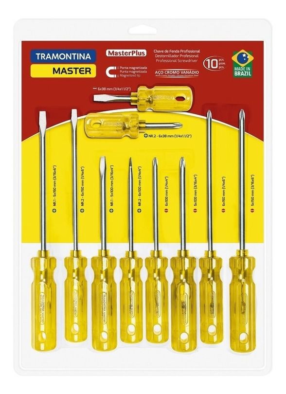 O Jogo de Chaves de Fenda Tramontina Masterplus em Aço Cromo Vanádio 10 Peças é completo para as exigências dos seus projetos e reparos da casa.