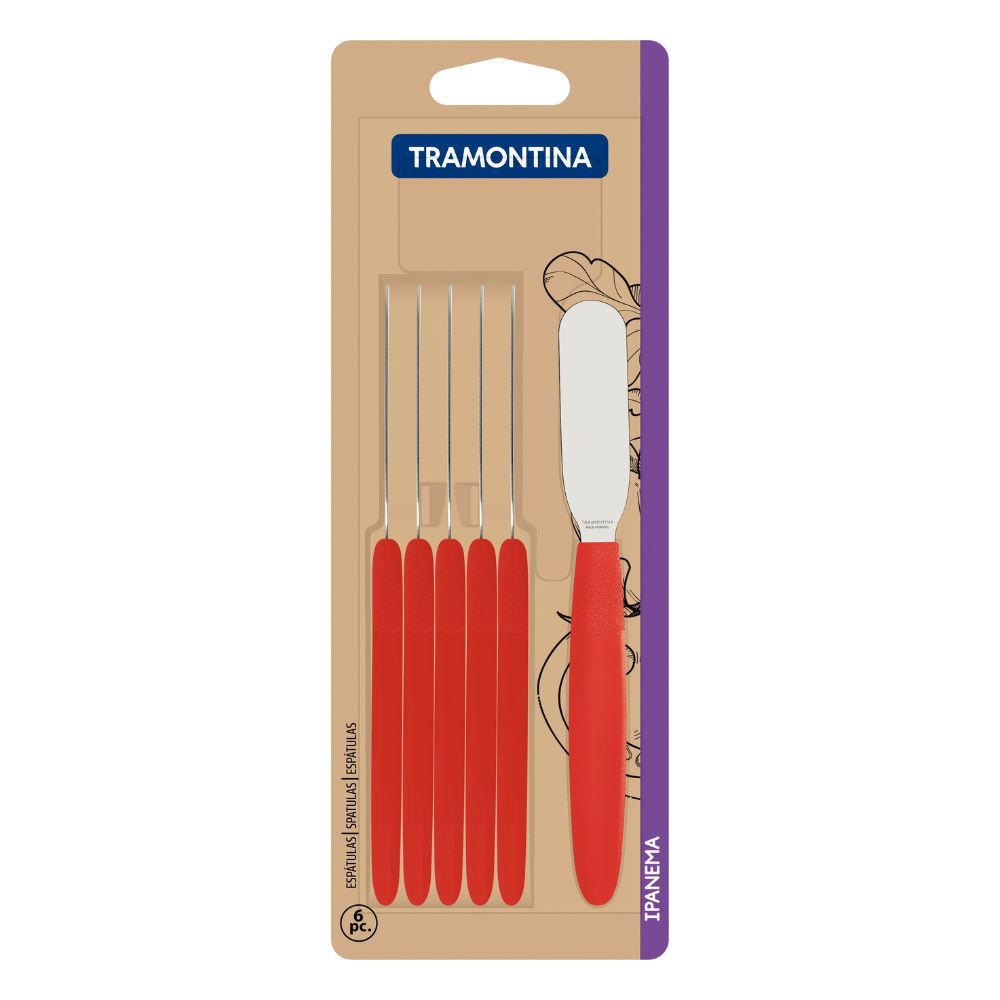 Então conte com o Conjunto de Espátulas para Manteiga Tramontina Ipanema com Lâminas em Aço Inox e Cabos de Polipropileno Vermelho 6 Peças.