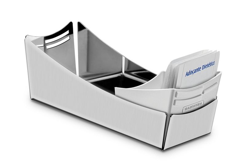 O porta sachês é produzido em aço inox durável, conta com detalhes vazados e pode ser lavado diariamente na máquina de lavar louças, sem afetar o seu material. A peça é a escolha certa para quem gosta de servir bem.