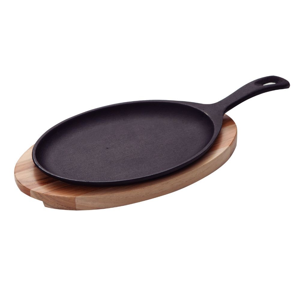 Combinando disco oval em ferro fundido, que pode ser utilizado diretamente no fogão, e base em madeira Teca, o kit mantém os alimentos aquecidos por mais tempo sem danificar a superfície de sua mesa de jantar.